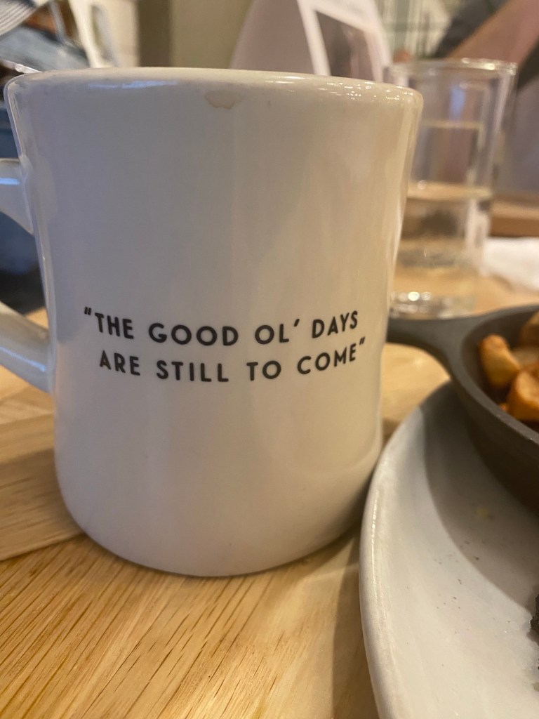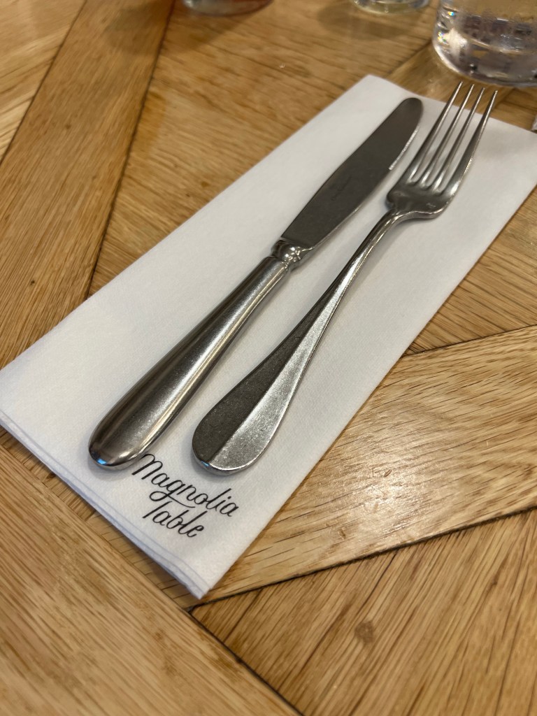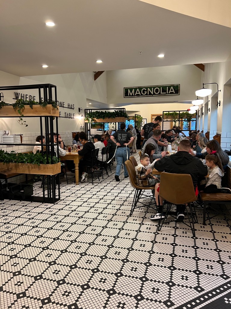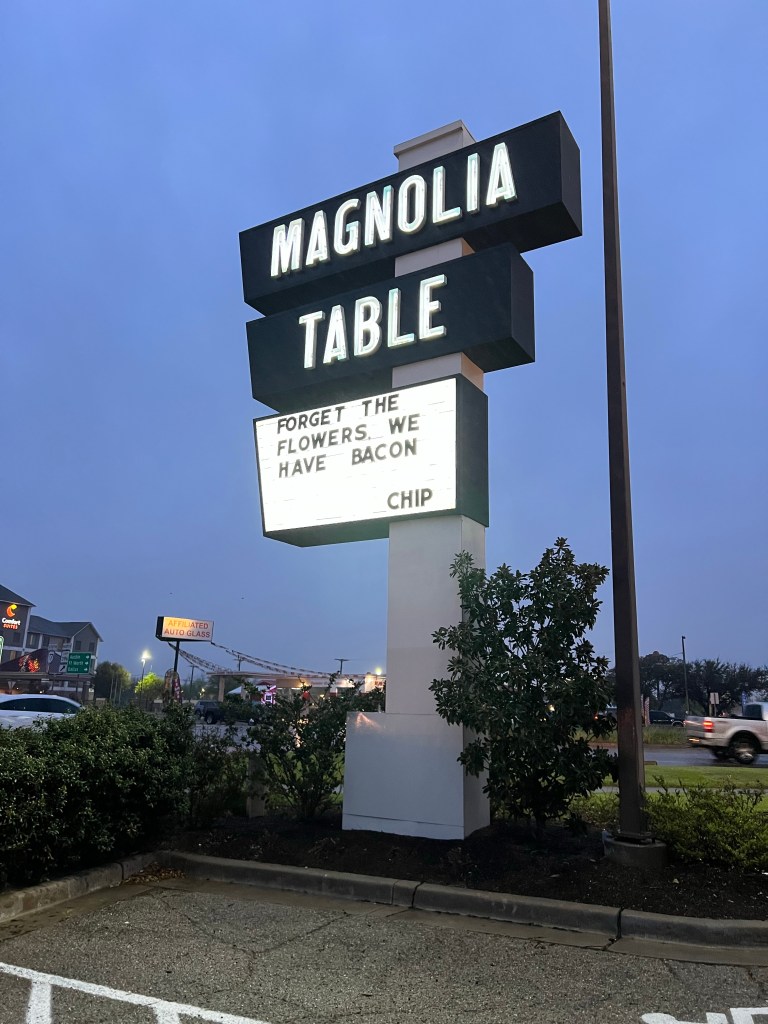 Magnolia Table opens at 7:00am. We pulled in at 7:15am, and the sun was not even completely up yet. The parking lot already had probably 10-15 cars and I jumped out and jogged to the front door. I put our name in and there was already an hour wait! I walked around outside and got pictures of their outdoor seating and the signs and the front of the building, before the sun was completely up.