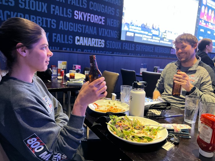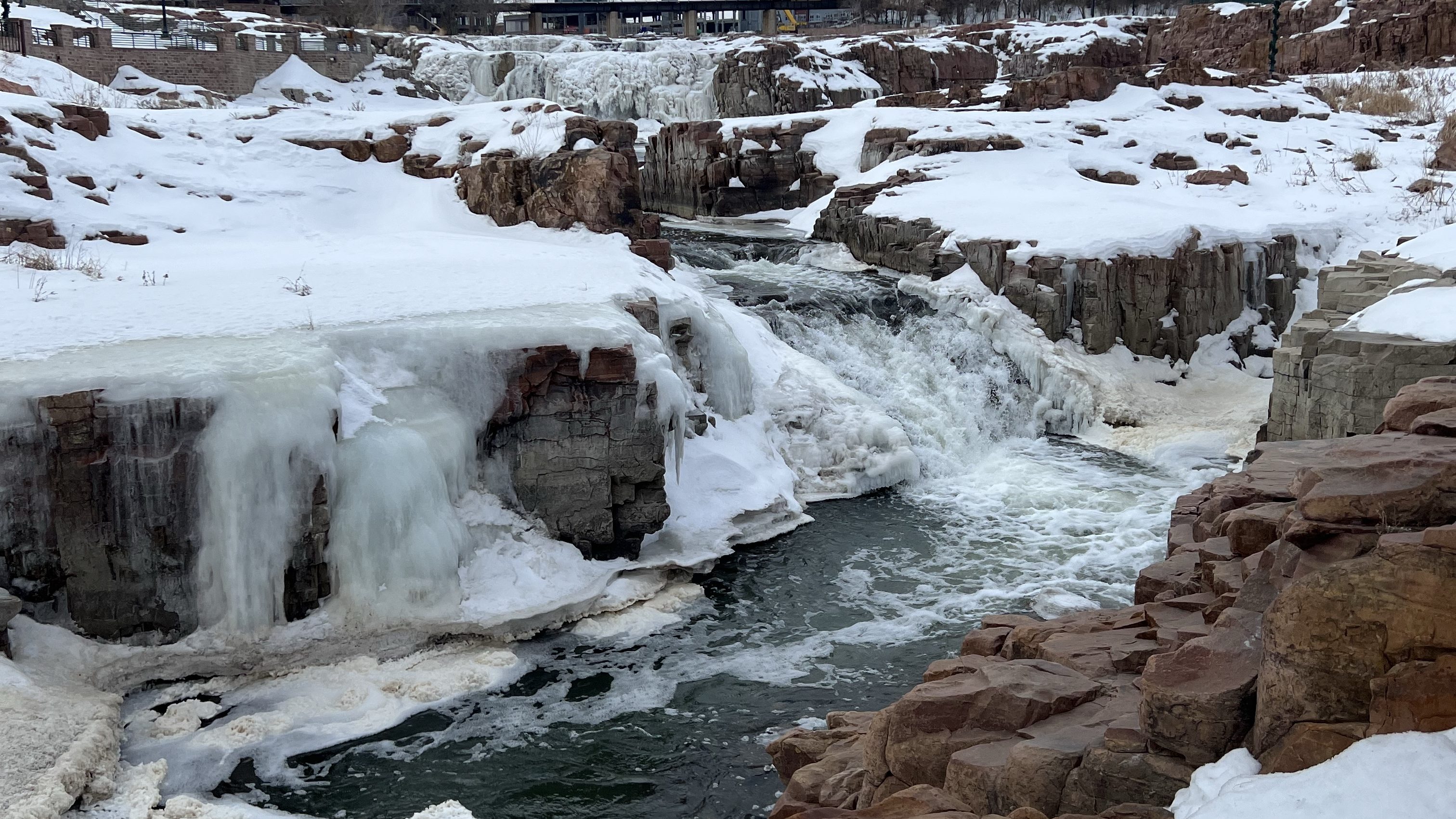 In between events I had time to explore downtown Sioux Falls and we went to Falls Park. There is also a visitors’ center and museum/giftshop however I did not have the opportunity to go in because it was closed for the day already. I am what some would call a waterfall chaser and if I see a trail or park has a waterfall, I have to go see it. There were multiple waterfalls at this park. They were all frozen almost completely solid and was incredible to see the giant icicles. Despite there being quite a bit of snow and a frozen waterfall, it didn’t feel 15 degrees. We walked all around the park and up and down the bridges and pathways that followed the river. We spent about an hour there and enjoyed every minute of it.
