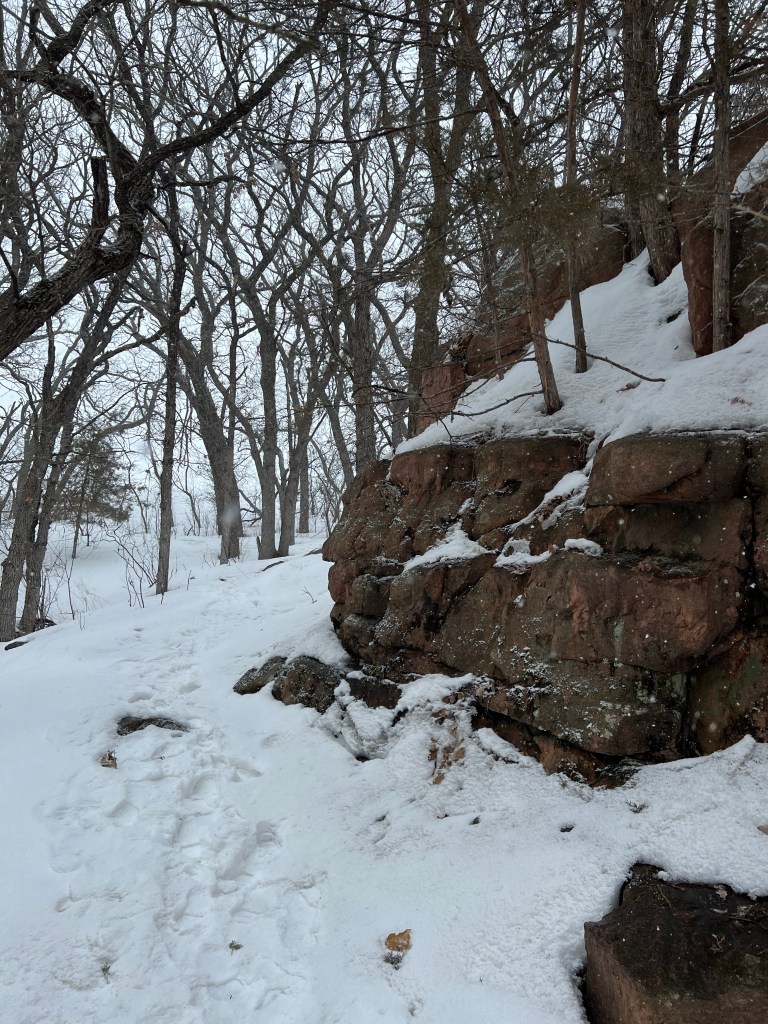 Some of us had a late flight out of Sioux Falls back home, so we had the entire day to explore. First, we stopped at Starbucks obviously. I got a honey almond cold brew it wasn’t my favorite, but I wanted to try something different. After that we headed to Palisades State Park in Garretson, South Dakota. We got there and there were tiny cabins to rent and on the decks of the cabins that overlooked large cliffs and a river. The views were gorgeous especially with the snow coming down. The sad detail of this stop was that we did not pack appropriately for a hiking trip we packed for a work trip. This meant we did not pack snowshoes or even just waterproof boots of any kind. If there had been many people, there and the snow was packed it would have been fine, but the snow was fluffy, and I sunk as soon as I stepped out of the car. We walked around a little but did not do any full trails. We did not spend too much time here and would love to come back when we are either dressed for the occasion or when it is not snowy.