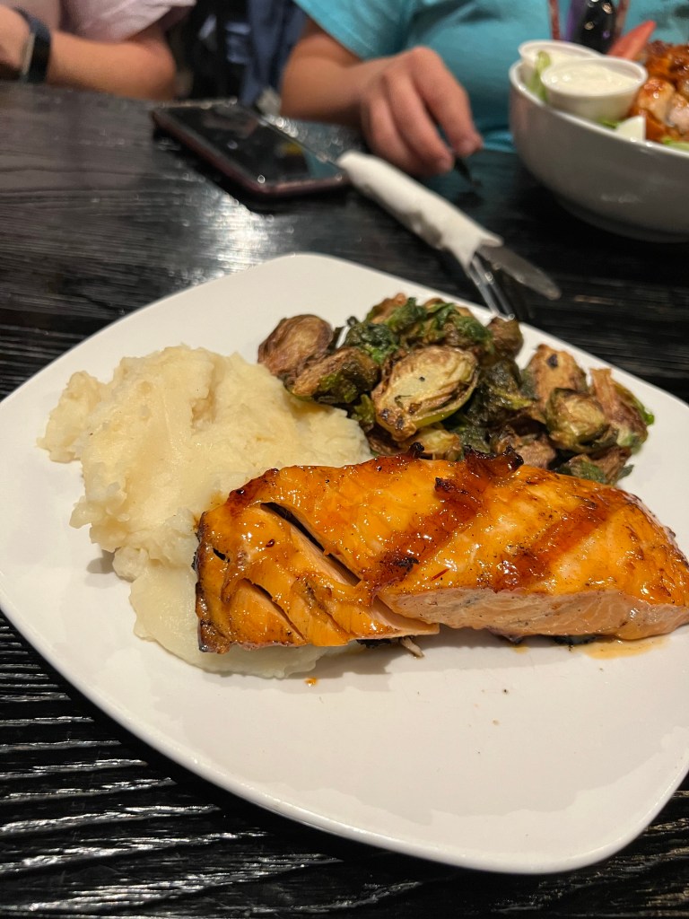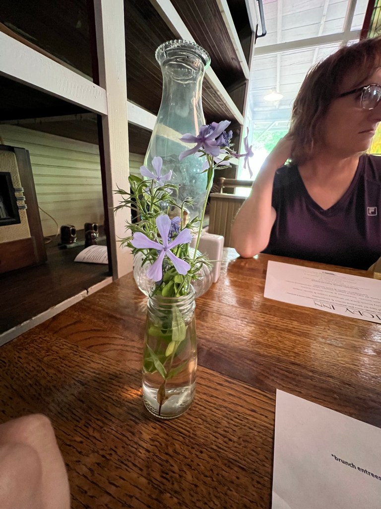 We shopped until we dropped! We walked back to our Airbnb and all fell asleep for a few minutes. We woke up and headed back out to Brown County State Park and wandered around trying to decide what to eat for supper. The decision of going to Hard Truth was made. Hard Truth is not just a restaurant. Hard Truth is also a distillery that offers tours; they have a beautiful outdoor seating area with string lights and live bands, a gift shop and more. The food was very good. The food that we ordered was The Nashville Hot Chicken salad, salmon and brussels spouts, pot roast, and burger with fries. Everyone really enjoyed their food. Since we were celebrating a birthday in the group they gave us some donuts with apple butter. They were very good and very sweet.