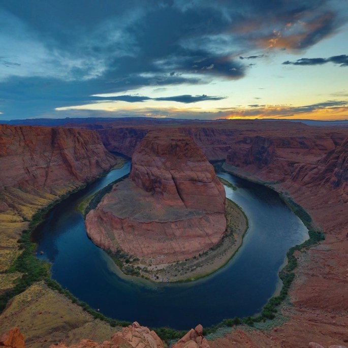 We made it to Horseshoe Bend with plenty time to spare before sunset thanks to the short cut. We found the perfect spot for overlooking the Colorado river far below. We watched kayakers and picnickers far below. As the sun began its slow descent, the kayakers floated on down the river and the sky lit up in soft, glowing waves of gold, and deep blue, — colors that felt too vibrant to be real. It was peaceful and everything grew quiet. All we could do was watch and take it in.